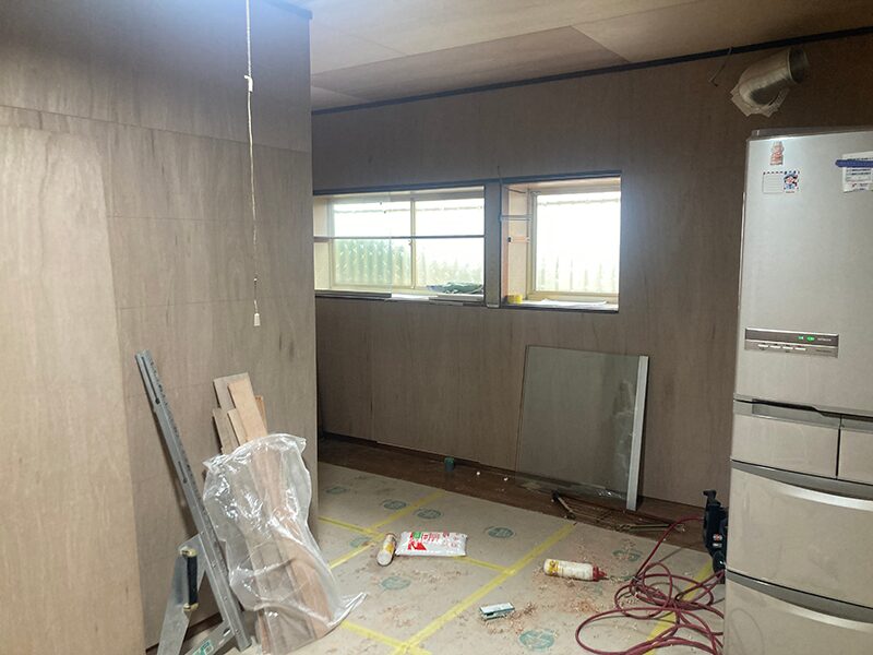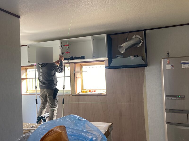 まずは既存のキッチン設備や吊戸棚を撤去し、壁や下地の状態を確認しながら工事を進めていきます。